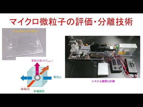 μmサイズの微小流路中において、磁場と電流を印加する電磁泳動と溶液の流れを組み合わせることによる、泳動速度からのマイクロ微粒子のサイズ・表面特性の評価やそれに基づく分離技術について展示します。