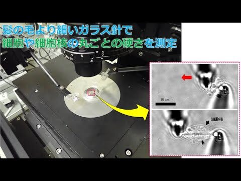 細胞や細胞核の硬さは,ガンなどの病気と密接な関係があることが知られています。髪の毛よりも細いガラスの針を使って,細胞や核の全体を大変形させたときに生じる力を計測し,硬さを評価する技術をご紹介します。