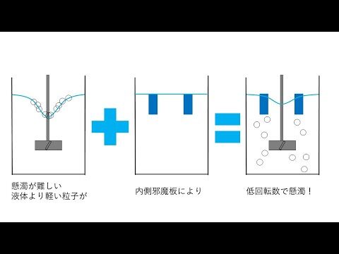 撹拌槽で多用されてきた邪魔板を使って、粘度の高い液体を混合する技術です。高粘度液体の混合には大きな撹拌翼を使用するのが一般的ですが、本技術では小型の撹拌翼で高粘度液体を混合できます。
